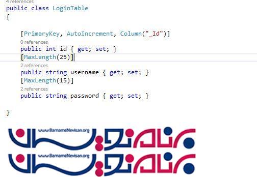 سپس به مسیر Solution Explorer-> Project Name->LoginTable.cs بروید و ستون های جدول را مطابق زیر ایجاد کنید.