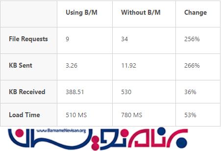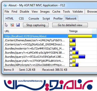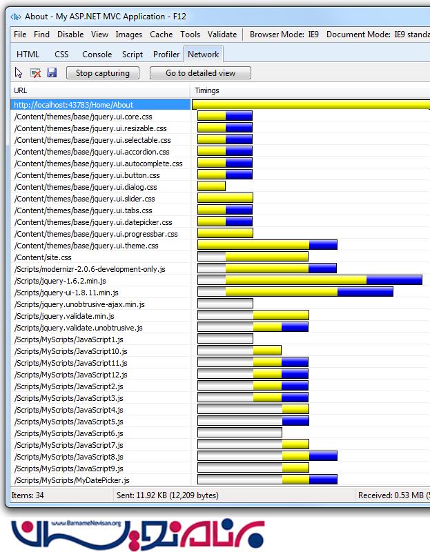 بایت های ارسالی بوسیله bundling کاهش چشمگیری دارند ، اما میزان کاهش بایت های دریافتی زیاد نیست ، به این دلیل که بزرگترین فایل های آن (Scripts\jquery-ui-1.8.11.min.js و Scripts\jquery-1.7.1.min.js) در حال حاضر minify شده اند .