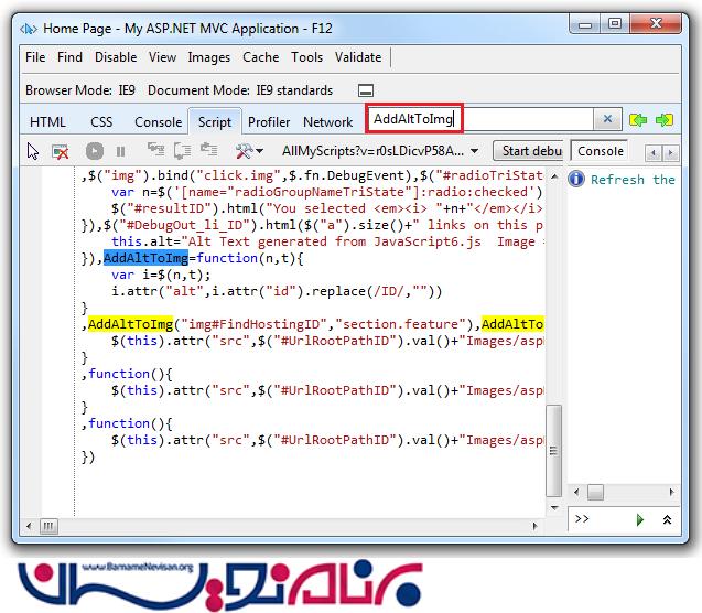 4. در Search Script ، نام تابعی را که میخواهید آن را debuge کنید را وارد کنید . همانطور که در تصویر مشاهده میکنید ما قصد اجرای AddAltToImg را داریم :