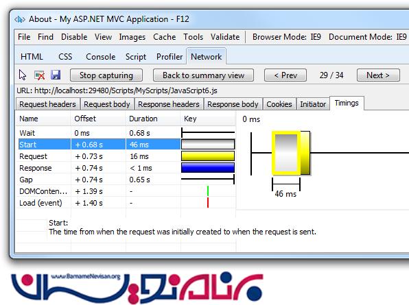 نوار های طوسی بدان معناست که درخواست توسط مرورگر در صف قرار گرفته است ، نوار زرد نشان دهنده بازه زمانی است از دریافت اولین بایت از درخواست تا زمانی که اول بایت از پاسخ ارسال شود . نوار آبی نیز نشان دهنده مدت زمان دریافت پاسخ از سرور است . برای مشاهده جزئیات زمانبندی شما میتوانید روی آنها double-click کنید . برای مثال تصویر زیر نشان دهنده زمان بندی برای فایل Scripts/MyScripts/JavaScript6.js/ میباشد .