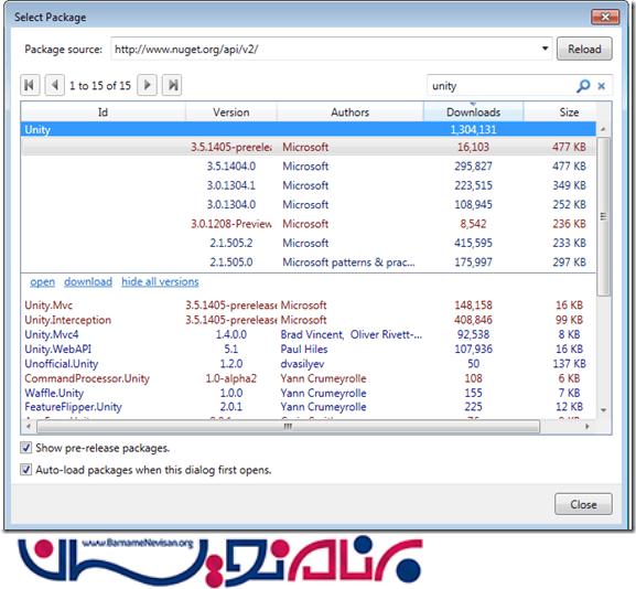 یک پنجره جدید باز میشود که همه ی NuGet packages ها لیست میشود.که شما میتوانید برای یک package خاص جستجو و همچنین یک نسخه مشخص را انتخاب کنید.