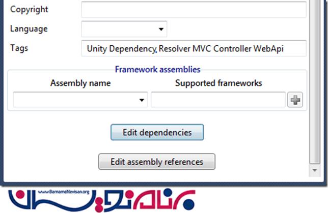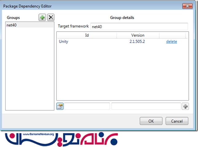 بر روی edit dependencie کلیک کنید سپس پنجره ی ackage Dependency Editor باز خواهد شد و شما میتوانید گروه خود را اضافه کنید و Dependency from NuGet feed. را اضافه کنید.