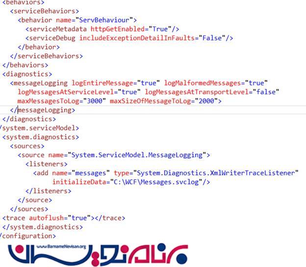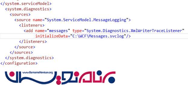 در تصویر بالا ، شما منبعی تحت عنوان Message logging پیدا خواهید کرد . این بدان معناست که diagnostics با System.ServiceModel.MessageLogging برای ثبت event data ، کنش و واکنش دارد . IntializeData آدرس محلی را میگیرد که ما میخواهیم داده ها را در آنجا log کنیم . XmlWriteTraceListener پیمایش را در فرمت XML ایجاد خواهد کرد .