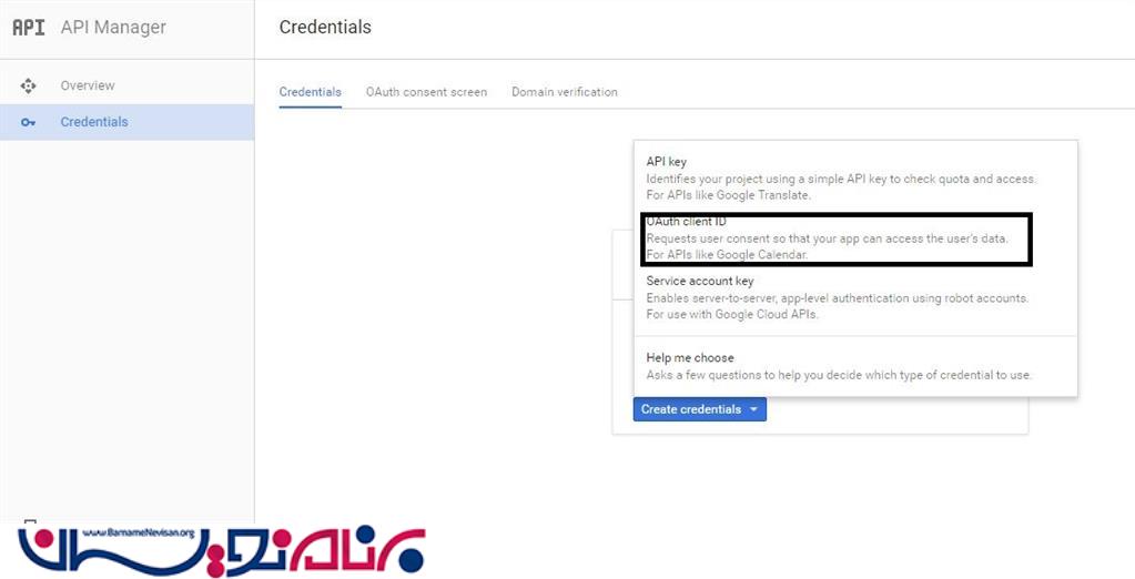 دوباره بر روی credentials کلیک کنید تا پنجره ی زیر برای شما باز شود و سپس بر روی ‘Create credentials’ و در اخر بر روی ‘OAuth client ID’ کلیک کنید.