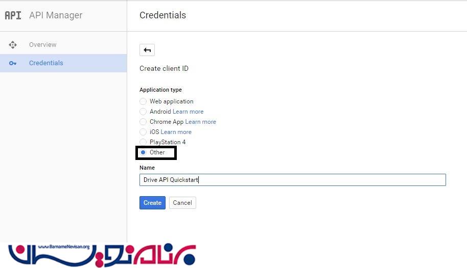 در زیر Other را انتخاب و نام آن را Drive API Quickstart’ بگذارید.