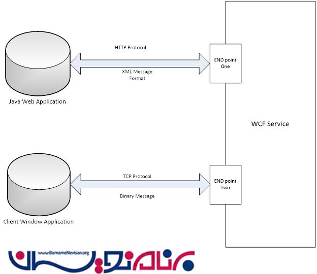 با WCF ، ما یک سرویس را پیاده سازی میکنیم ، و ما هر تعداد ، نقطه پایانی که برای پشتیبانی از تمام کاربران را نیاز داشته باشیم را پیکربندی میکنیم . برای پشتیبانی از نیاز های دو کاربر بالا ، ما باید دو نقطه ی پایانی را پیکربندی کنیم ، در پیکربندی نقاط پایانی ، ما میتوانیم پروتکل و نوع فرمت بندی پیام ها را مشخص کنیم .