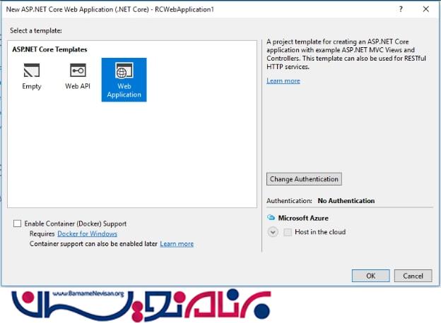 قالب این پروژه Cross Platform است و میتوان پروژه ها را بر روی فریم ورک .NET Core اجرا کرد. برای مکان این پروژه مسیر E:\Sample\ را تعریف کرده و بر روی دکمه OK کلیک کنید. سپس صفحه زیر ظاهر می شود که باید قالب پروژه خود را تنظیم کنید.