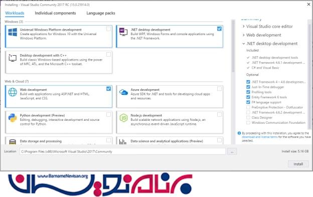 Visual Studio 2017 RC برای انتخاب ابزارها مسیر هوشمند و سفارشی شده ای را ارائه می دهد. برای نصب .NET Core، نیاز است .NET Core را در قسمت workloads انتخاب کنید.