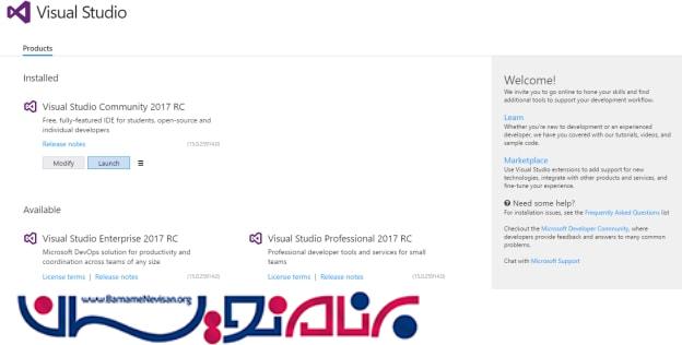 در تصویر بالا دو دکمه وجود دارد،Modify برای انتخاب Componentهای بیشتر و Launch برای اجرای Visual Studio 2017 RC است و ایکن باری که کنار آن ها قرار گرفته برای گزینه های Unistallو Repair می باشد.