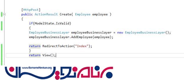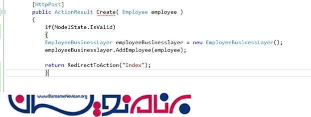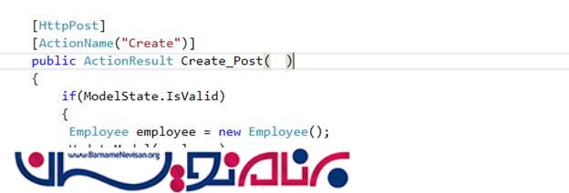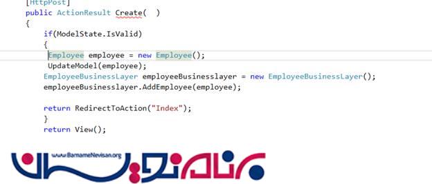 فقط یک چیزی که باقی می ماند این است که ، ما در اینجا ممکن است تعدادی خطای valid modelation داشته باشیم که در اینجا استفاده از مشخصه IsValid شی model state را میطلبد . به کد زیر توجه فرمایید :