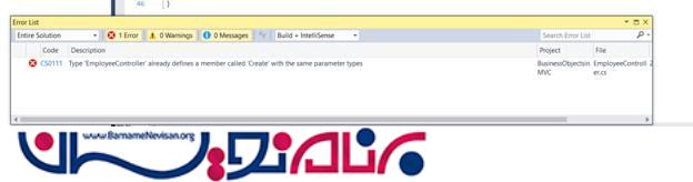حال اگر توجه داشته باشید ، دراینجا دو متد Create وجود دارد که هر دوی آنها نام یکسان دارند و هیچکدام از آنها هم پارامتری را دریافت نمیکنند . پس امکان Overloading وجود ندارد .