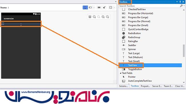 از بین ابزار های موجود، دوتا TextView بکشید و به درون صفحه بیاورید.