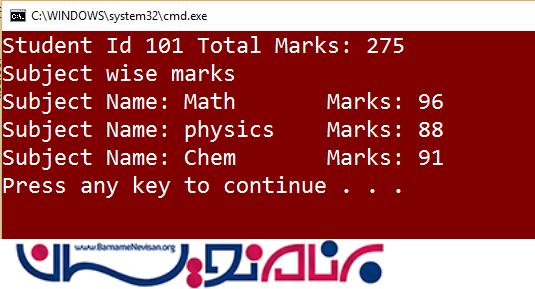 WriteLine($ "Subject Name: {subject.SubjectName} \t Marks: {subject.Marks}");