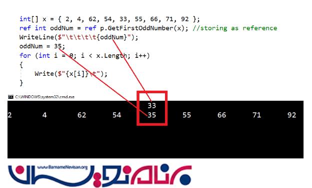 همانطور که در مثال قبل مشاهده کردید ، ما به دنبال یک عدد فرد در داخل آرایه هستیم ، اگر آن را پیدا نکرد یک exeption بدهد با این مضمون که متد مقداری باز نمیگرداند اما reference دارد . بنابراین ، شما عددی را که باید به عنوان reference بازگرداننده شود را ذخیره کنید . برای ذخیره سازی این متغیر محلی ، ما میتوانیم از کلمه کلیدی ref استفاده کنیم ، به کد زیر توجه کنید :