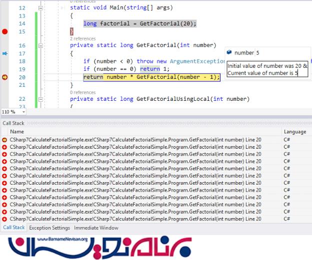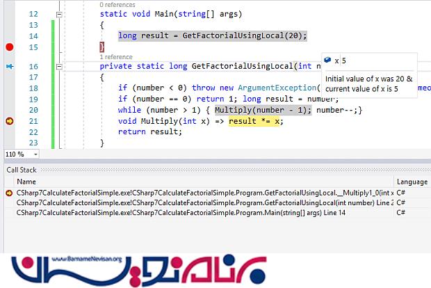 شما در تصویر بالا میتوانید استفاده از call stack را مشاهده کنید .