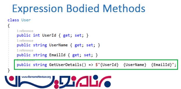 در مورد Expression Bodied Methods ، این باید یک return type ، name و returned expression داشته باشد .