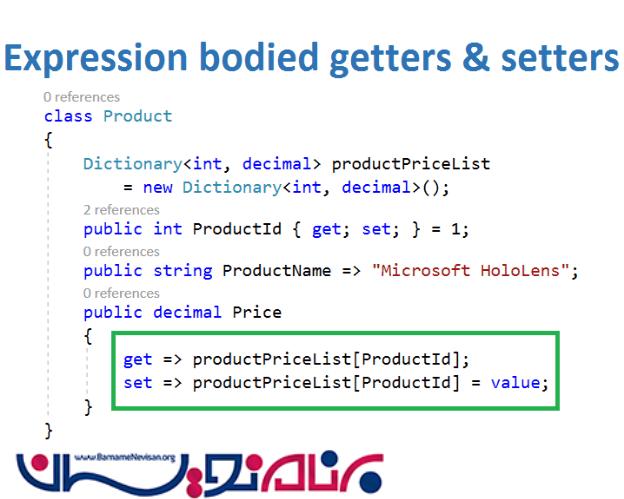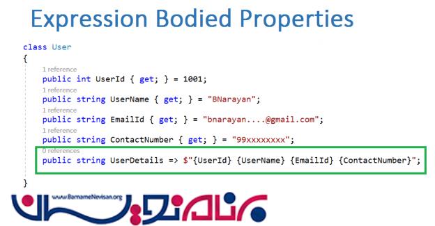 Expression bodied members یک ظرفیت جدید در 7.0 #C نمیباشد . این در 6.0 #C معرفی شد اما در این نسخه جدید ، بهبود پیدا کرد . اگر شما با Expression bodied members آشنایی ندارید ، ما یک توضیح مختصر و کوتاه در این مورد خواهیم داشت .