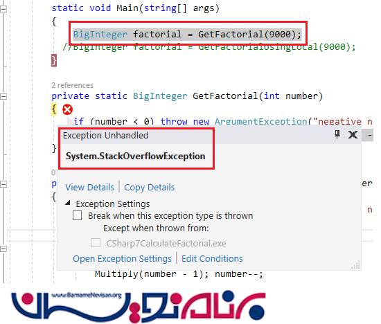 همانطور که در تصویر بالا مشاهده میکنید تابع بازگشتی با خطای System.StackOverflowException مواجه شد و روند اجرای برنامه متوقف شده است .