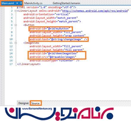 اگر مراحل بالا را به درستی انجام داده باشید، کدهای زیر در صفحه ی Main.axml شما قرار خواهند داشت.