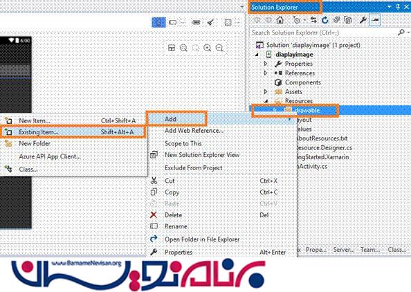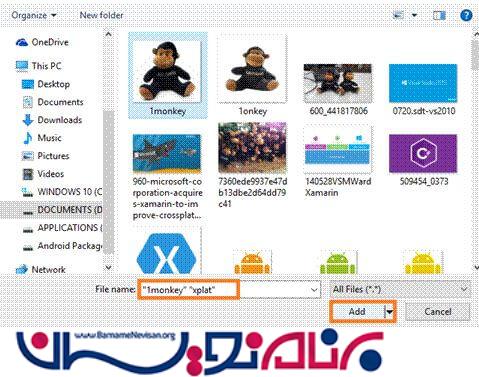 وقتی مطابق تصویر بالا به مسیر Solution Explorer-->Resource-->Drawable-->Right click-->Add-->Existing Item رفتید، یک فایل را مطابق زیر انتخاب نمایید.