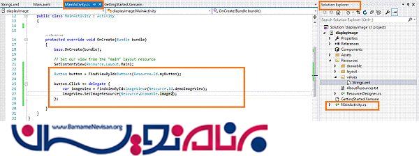 سپس به صفحه ی MainActivity.cs بروید و کدهای زیر را در آن وارد نمایید.
