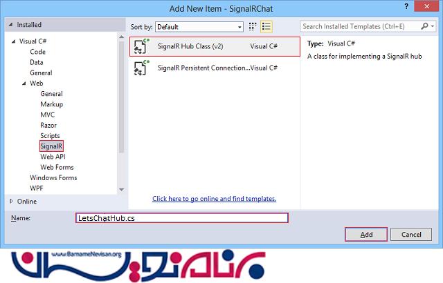 این Scripts ها برای فعال سازی SignalR در View Page مورد استفاده قرار خواهد گرفت . ما نیاز به اضافه کردن یک کلاس Hub به فولدر Hubs داریم ، نام این کلاس را LetsChatHub.cs میگذاریم . که همانند زیر است .