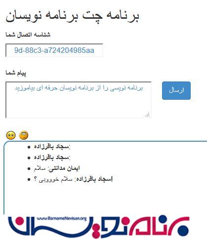 زمانی که شما نام خود را وارد میکنید ، شما یک TextBox خواهید دید که از شما شناسه اتصال دوستی که قصد چت کردن با آن را دارید را میخواهد ، بعد از آن کافیست یک پیام ارسال کنید ، یک popUp جدید باز خواهد شد که شناسه اتصال شما را خواهد داد . این Id را در اختیار دوست خود قرار دهید . به یاد داشته باشید که تنها کسی که شناسه اتصال شما را دارد توانایی ارسال پیام به شما را دارد .