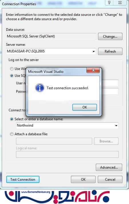 سپس بر روی Test Connection برای اطمینان از رشته ی اتصال کلیک کنید