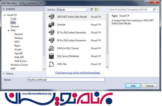 از پنجره ی باز شده ، ADO.NET Entity Data Model را انتخاب و سپس نام آن را NorthwindModel بگزارید و سپس add را کلیک کنید.