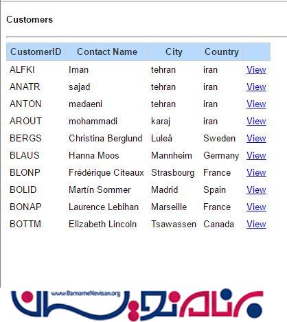 برای نمایش رکورد ها از یک table html استفاده شده است. یک حلقه برای پر کردن data های جدول از table Customer اجرا شده است.