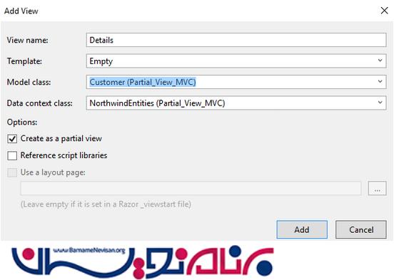 برای اضافه کردن یک partialview شما نیاز به راست کلیک برروی کنترلر و کلیک بر روی addview دارید.