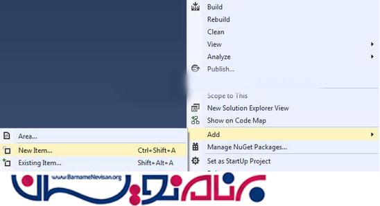 در اینجا شما نیاز به Entity Data Model در برنامه خود دارید که باید بر روی Solution Explorer کلیک راست کرده و سپس بر روی Add و در آخر New Item را بزنیم تا بتوانیم data model خود را ایجاد کنیم.