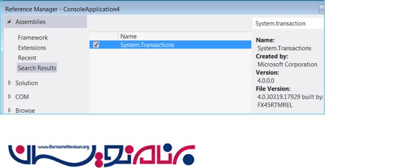 System.Transactionsبه صورت پیش فرض قابل دسترس است، نیاز هست تا ما رفرنس را اضافه کنیم.