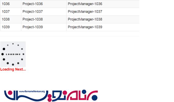 مورد نیاز- ما 500 پرونده در DataSource داریم(فایل های متنی یا پایگاه داده).زمانیکه صفحه برای اولین بار بارگذاری میشود فقط 20 تا از رکورد ها را نمایش میدهد.زمانیکه کاربر به سمت پایین اسکرول کند ،این نتیجه بعدی را نمایش میدهد.