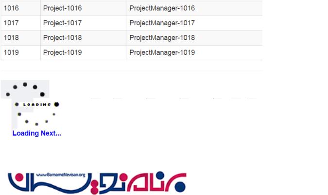 زمانیکه ما تغییرات را انجام میدهیم به برنامه اجازه Browse میدهیم.به صورت پیشفرض 20 تا رکورد را بارگذاری میکند و زمانیکه شما اسکرول کنید 20 تای بعدی را با ایکن Loading بارگذاری میکند.در شکل1 Id اخرین پروژه 1019 است.در شکل2 ،1039 است.بنابراین شما میتوانید بدانید که وقتی صفحه را به سمت پایین اسکرول کنید داده های بعدی بارگذاری میشوند.