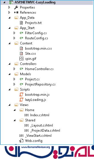 برای توصیف از لحاظ فنی برای بالا باید ذکر کنیم که ما از فایل متنی که دارای 500 رکورد است به عنوان DataSource استفاده میکنیم.اکشن کنترلر20 تا از رکورد ها را برای اولین بار بارگذاری میکند.زمانی که کاربر به سمت پایین اسکرول میکند ، این به سرور درخواستی از نوع Ajax برای بارگذاری بقیه رکورد ها میدهد.قطعه کدی از جاوا اسکریپت با استفاده از چک کردن ارتفاع صفحه و طول اسکرول زمانی که کاربر به سمت پایین اسکرول کند چک میکند.عکس زیر ساختار پروژه است.قدم زیر را دنبال کنید.