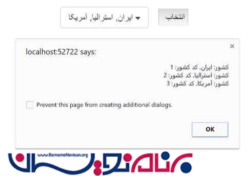 در این بخش به نوشتن کدهای جاوااسکریپت که برای ارزیابی و نمایش نتیجه مورد نیاز است، می پردازیم. کدهای نوشته شده در زیر دارای دو بخش است، در بخش اول خصوصیات تگ select که دارای شناسه ddlCountry تنظیم شده است. در بخش دوم تابع GetSelectedCountries پیاده سازی شده است که به وسیله یک حلقه، تمامی گزینه های داخل تگ select را بررسی می کند و اگر selected آن گزینه فعال باشد یعنی آن گزینه توسط کاربر انتخاب شده است و مقادیر آن option به متغییر selectedCountries اضافه می شود. همچنین در آخر یک شرط قرار داده شده است که اگر متغییر selectedCountries دارای مقدار بود، مقدار آن را به وسیله alert نمایش دهد و در غیر این صورت به کاربر اعلام شود که گزینه ایی انتخاب نشده است.