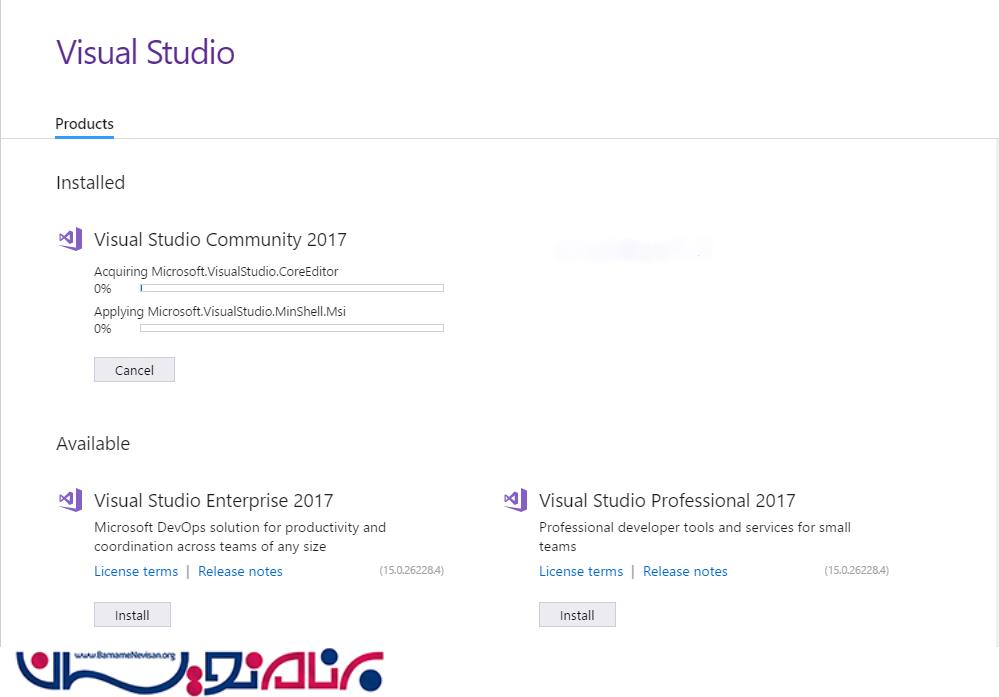 پنجره محصولات Visual Studio بار میشود و مانند عکس زیر همان زمان که در حال نمایش به شما است شروع به دانلود می کند.