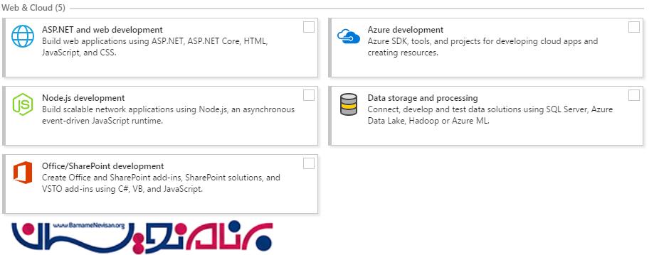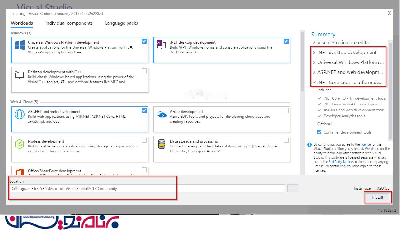 پنجره نصب ویژوال استودیو انجمن 2017 باز خواهد شد.شما باید workloads مورد نیاز را مانند شکل زیر انتخاب کنید.به عنوان مثال گزینه های .NET Desktop development ، Universal Window development ، Web development ، .NET Core cross-platform را به عنوان workloads انتخاب کردیم.ما همان محل پیشفرض را برای نصب انتخاب میکنیم.سپس بر روی دکمه Install کلیک کنید.