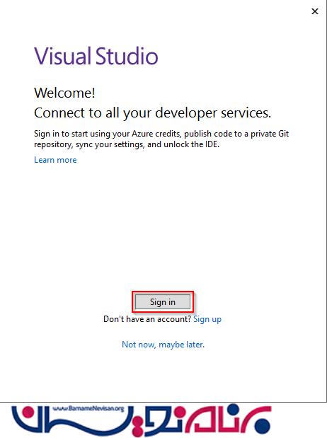پنجره Sign ویژال استودیو باز خواهد شد و برای شروع به ثبت نام در حساب Azure نیاز دارد ، کد انتشار پروژه را در یک ریپاسیتوریه محرمانه گیت قرار دهید و تنظیماتتان را انجام دهید.سپس بر روی Sign کلیک کنید .