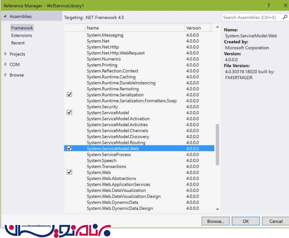 سپس ما نیاز داریم تا چارچوب System.ServiceModel.Web را به reference های پروژه اضافه کنیم. برای اینکار روی نام پروژه راست کلیک کرده و گزینه Add Reference را انتخاب کنید.