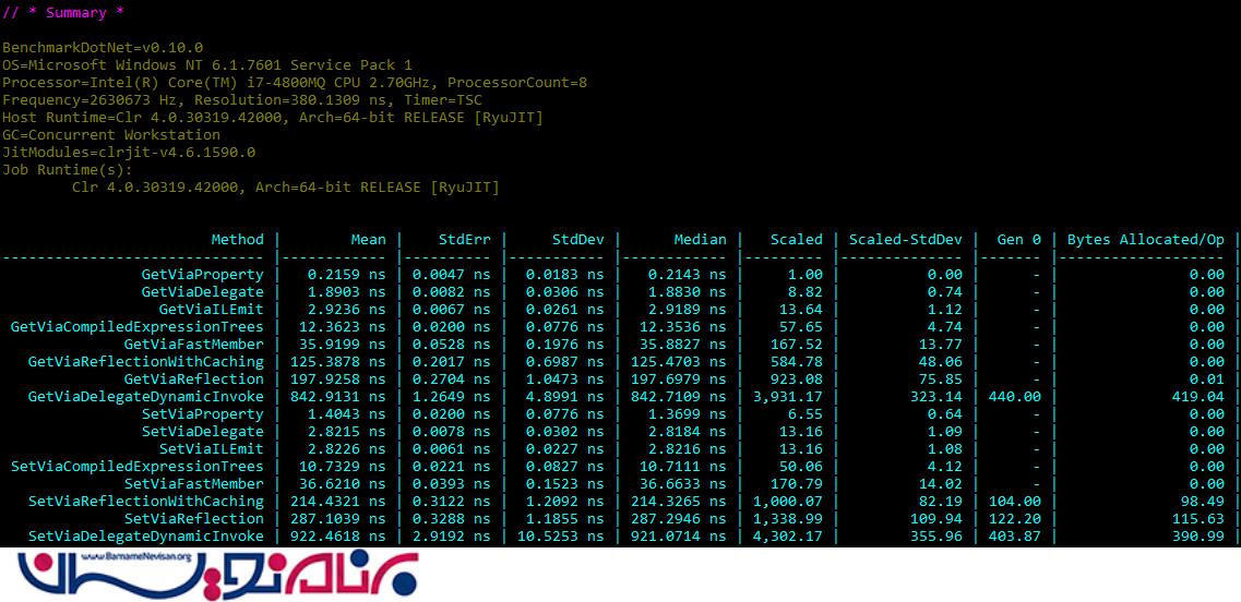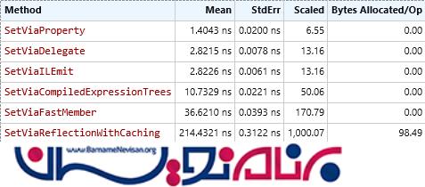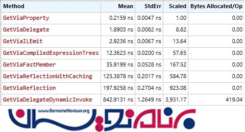 بعد از آن یک پیشرفت سرعت به وجود می آید به وسیله مرجع PropertyInfo، سپس واکشی اطلاعات در هر بار. اما ما هنوز کندتر از قبل دسترسی داریم به خاصیت آن هم بصورت مستقیم، که نشان می دهد که در اینجا هزینه فراخوانی وجود دارد.