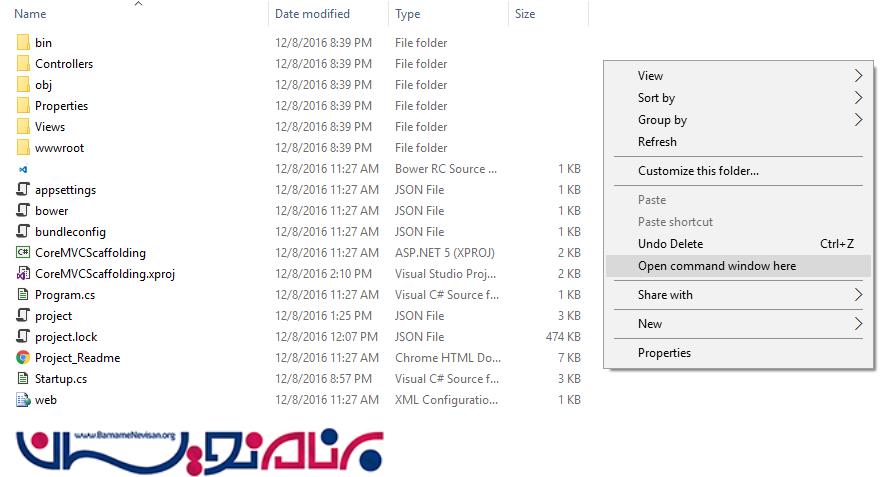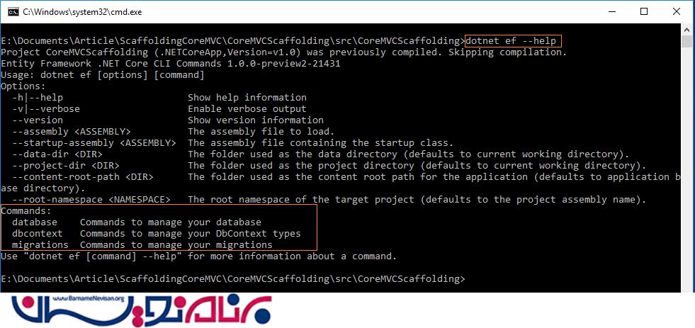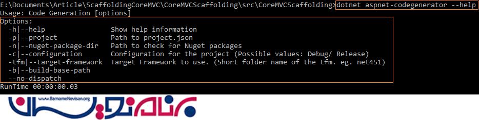 می توان از طریق CommandLine در پروژه هایمان از Scaffold استفاده کنیم. به دایرکتوری پروژه رفته و کلید Shift را نگه دارید و راست کلیک کنید و command window را انتخاب کنید. برای مشاهده اطلاعات کمکی از دستور زیر استفاده کنید