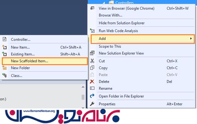 روی فولدر کنترلر راست کلیک کرده و پس از انتخاب ADD گزینه New Scaffolding Item را انتخاب کنید.