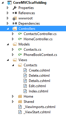 C:\Program Files\dotnet\dotnet.exe aspnet-codegenerator --project "E:\Documents\Article\ScaffoldingCoreMVC\CoreMVCScaffolding\src\CoreMVCScaffolding" controller --force --controllerName ContactsController --model CoreMVCScaffolding.Models.Contacts --dataContext CoreMVCScaffolding.Models.PhoneBookContext --relativeFolderPath Controllers --controllerNamespace CoreMVCScaffolding.Controllers --useDefaultLayout Finding the generator 'controller'... Running the generator 'controller'... Attempting to compile the application in memory Attempting to figure out the EntityFramework metadata for the model and DbContext: Contacts Added Controller : \Controllers\ContactsController.cs Added View : \Views\Contacts\Create.cshtml Added View : \Views\Contacts\Edit.cshtml Added View : \Views\Contacts\Details.cshtml Added View : \Views\Contacts\Delete.cshtml Added View : \Views\Contacts\Index.cshtml RunTime 00:00:07.87