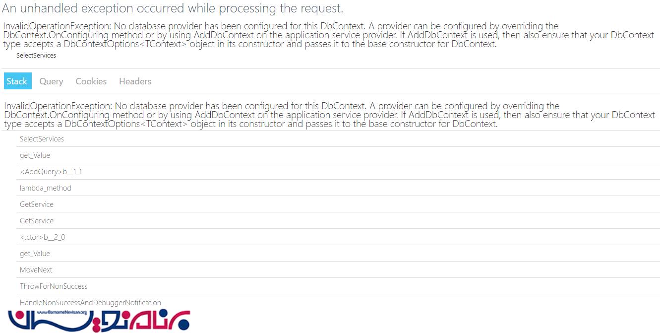 این خطا بیان می کند که هیچ تامین کننده دیتابیسی برای این DbContext تنظیم نشده است. توجه کنید که ما از AddDbContext در داخل متد ConfigureServices(IServiceCollection services) استفاده کرده ایم.