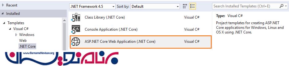 از منوی سمت چپ .Net Core را انتخاب کرده و سپس گزینه ASP.Net Core Web Application را انتخاب کنید.