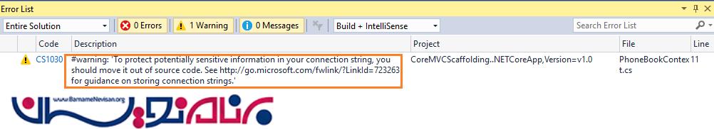 همانطور که مشخص است، کنترلر و View از روی model ساخته شد. در داخل برنامه در بخش Error List یک اخطار در مورد انتقال اطلاعات حساس از طریق DbContext، نمایش داده می شود