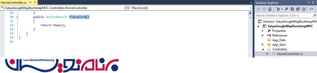 صفحه اصلی و آغازین برنامه را، همان صفحه ایی که در آن کدهای بالا را نوشته ایم قرار می دهیم، یعنی اکشن متد PlaceCord از داخل کنترلر Home.