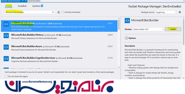 در تب Browse نوع "Microsoft.Bot.Builder" را انتخاب کنید. (توسط جستجو آن را پیدا کنید)